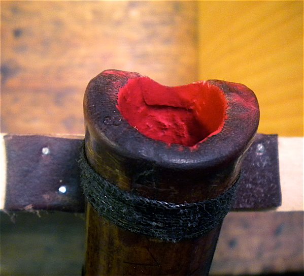 Perry removed the recently added red urushi and paste, and the older flaking urushi in the rest of the bore. The top of the bore was widened slightly to increase the resonance of otsu Ro. There was a divot under the front of the ivory inlay and it was decided the best route was to coat the inlay with rubbed layers of shuai urushi for a cool translucent antique effect. Perry also gave the flute's bore a layer of new shuai to replicate the original layer of urushi it had when first made.